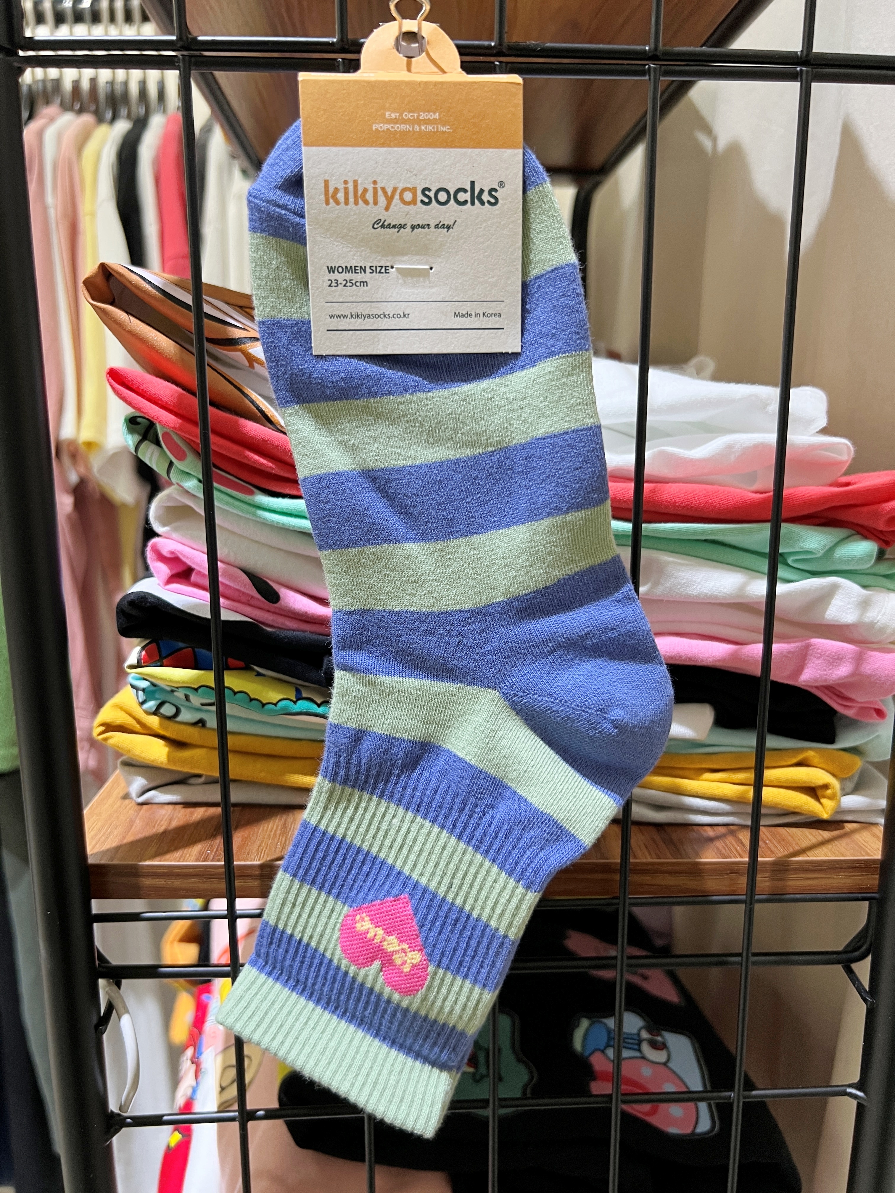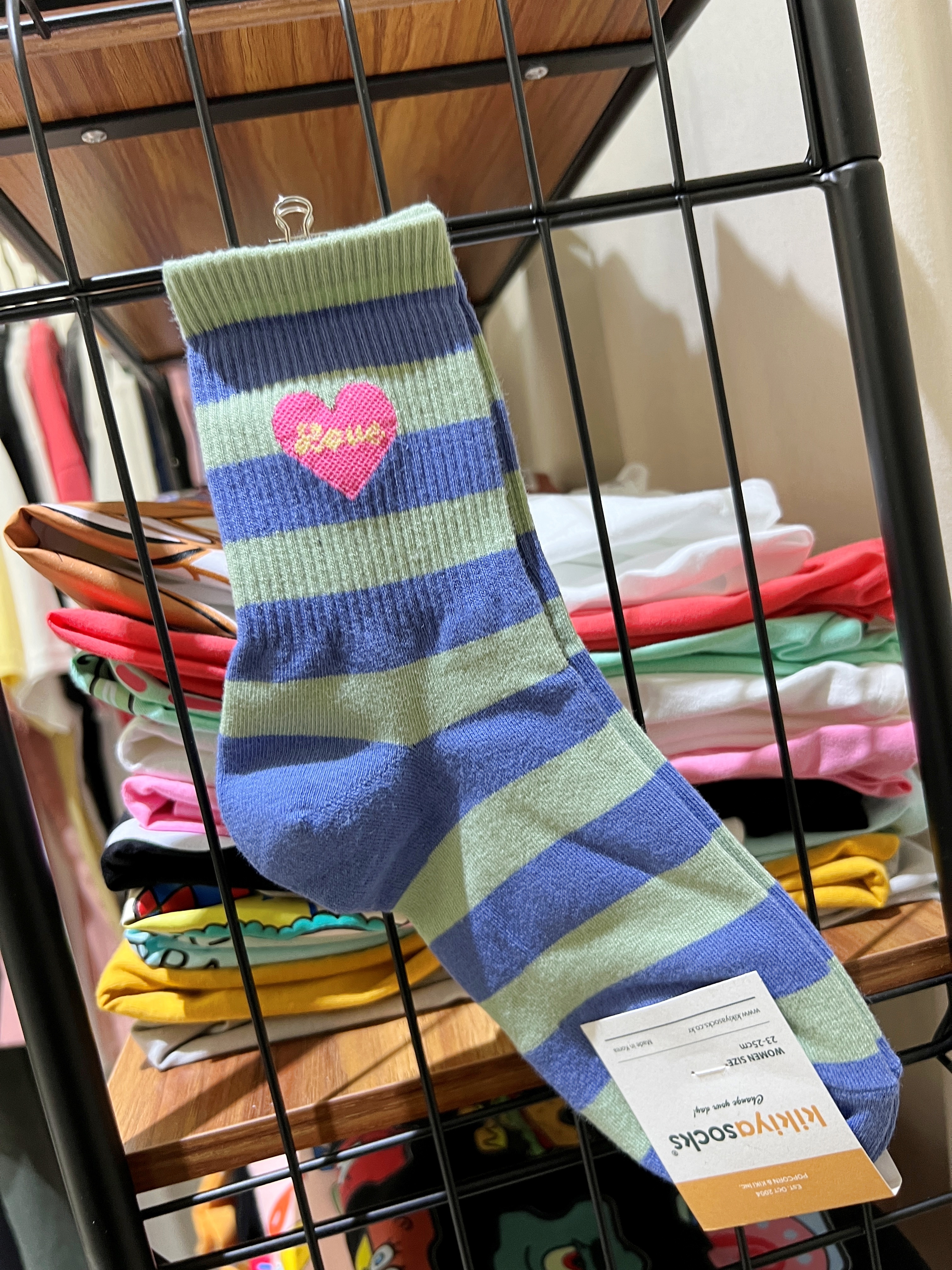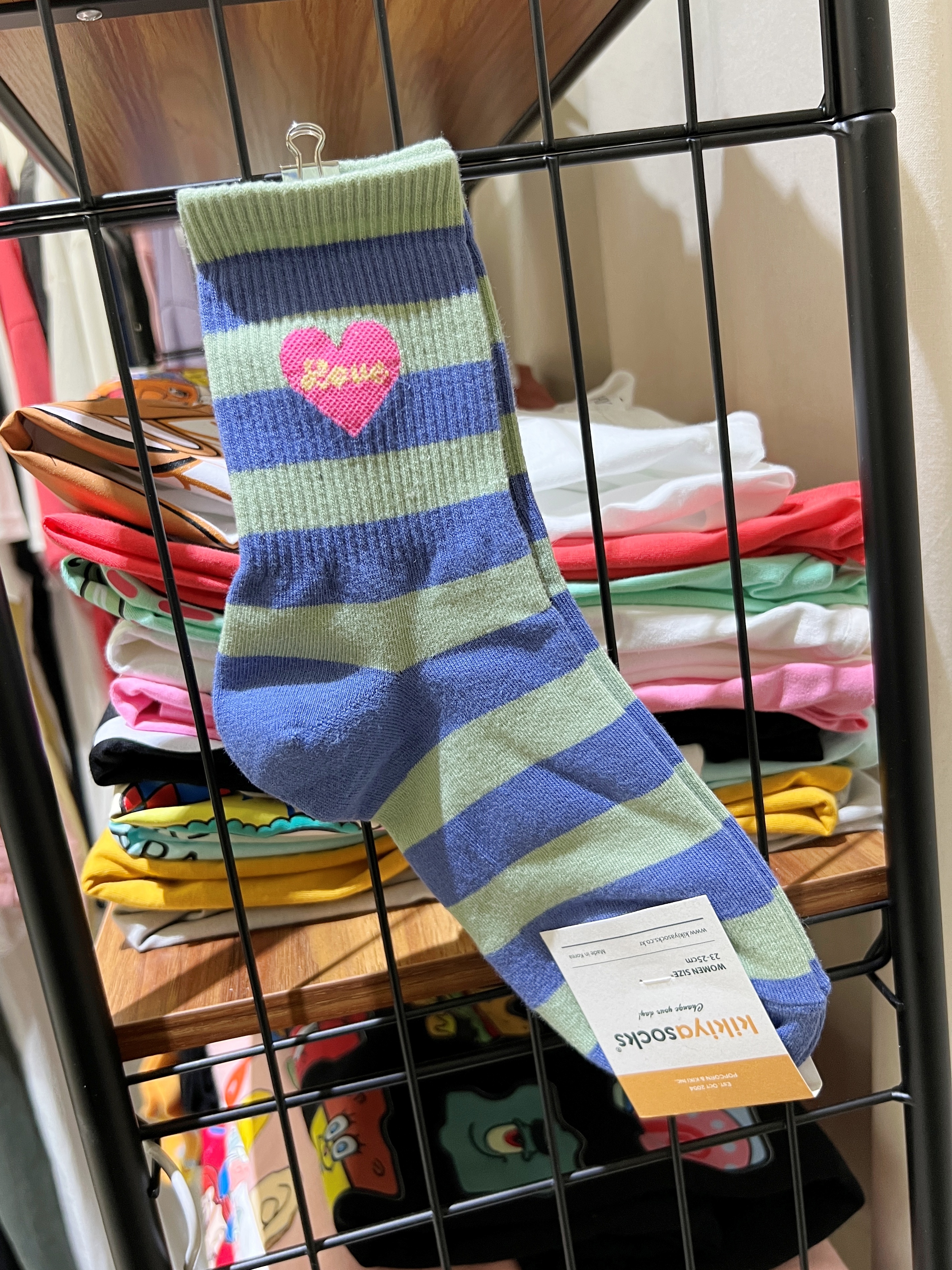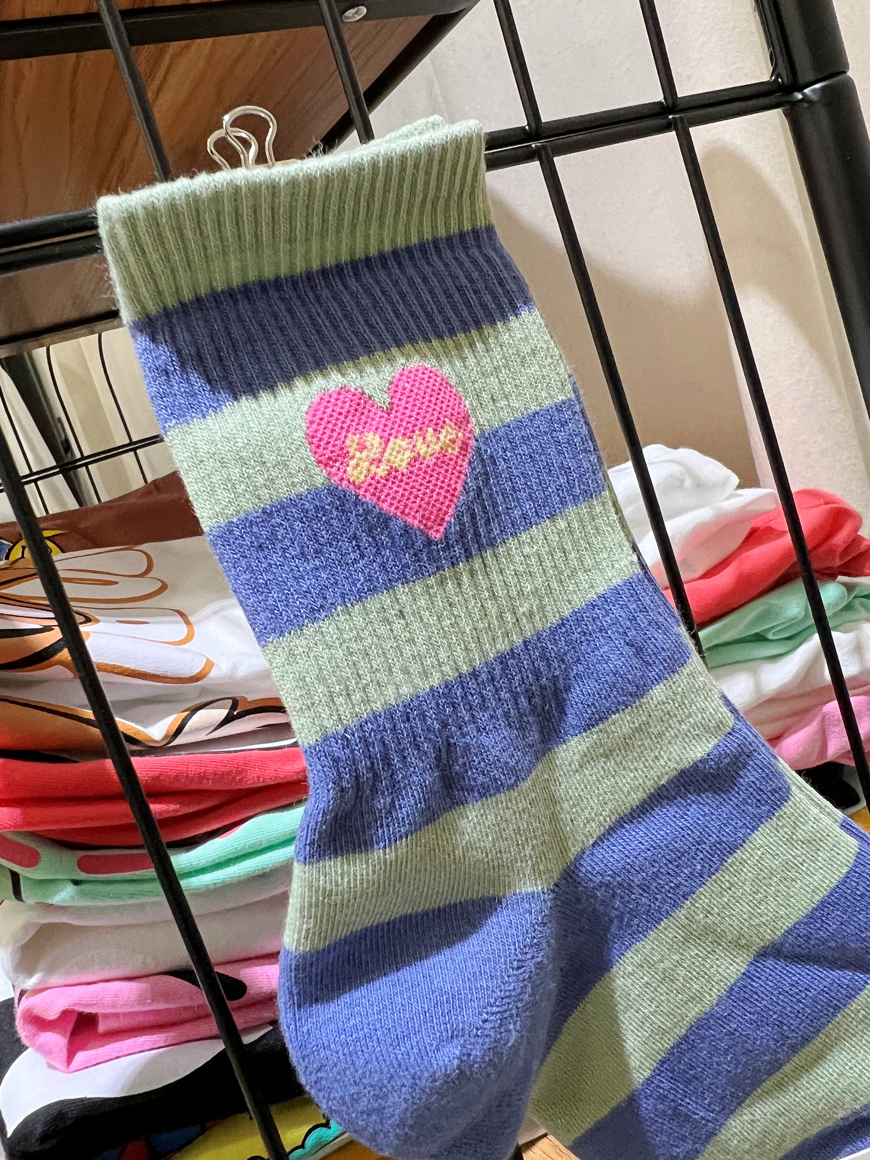 正韓跳色藍綠條紋愛心襪