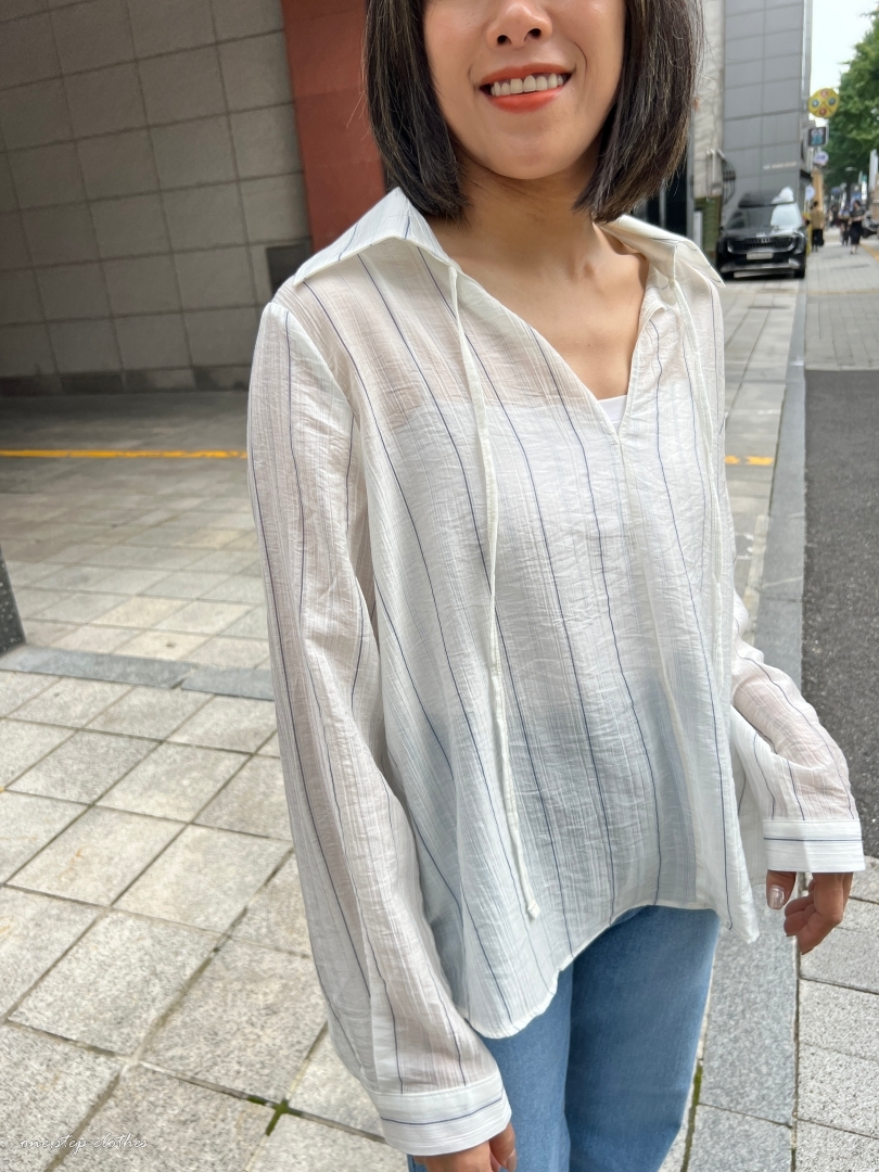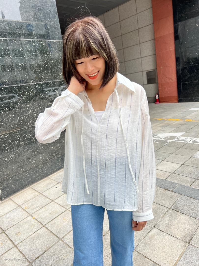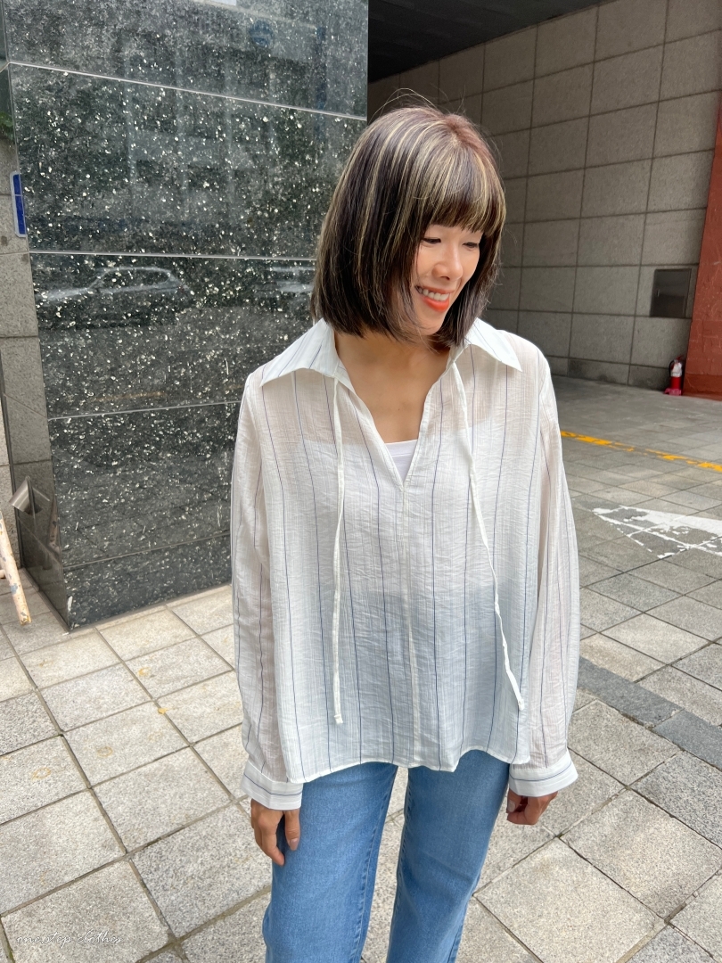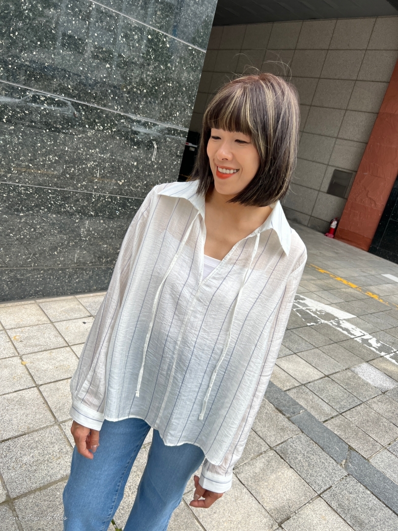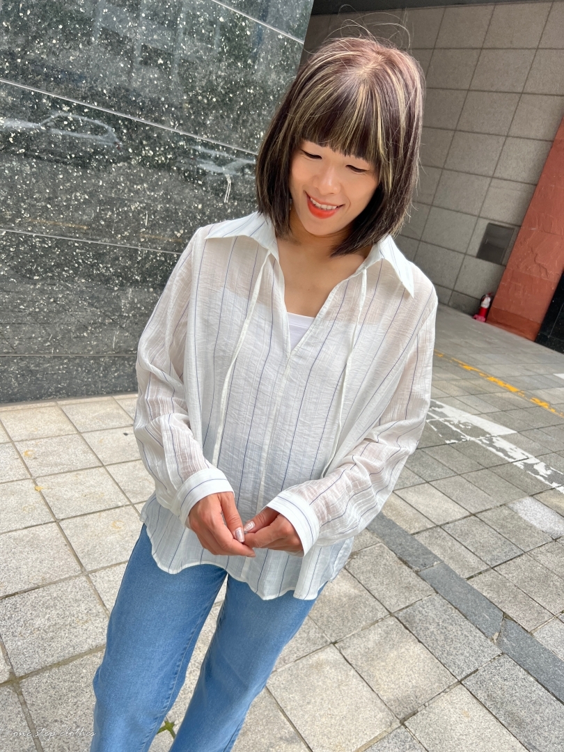 正韓慵懶清透感V領直條衫
