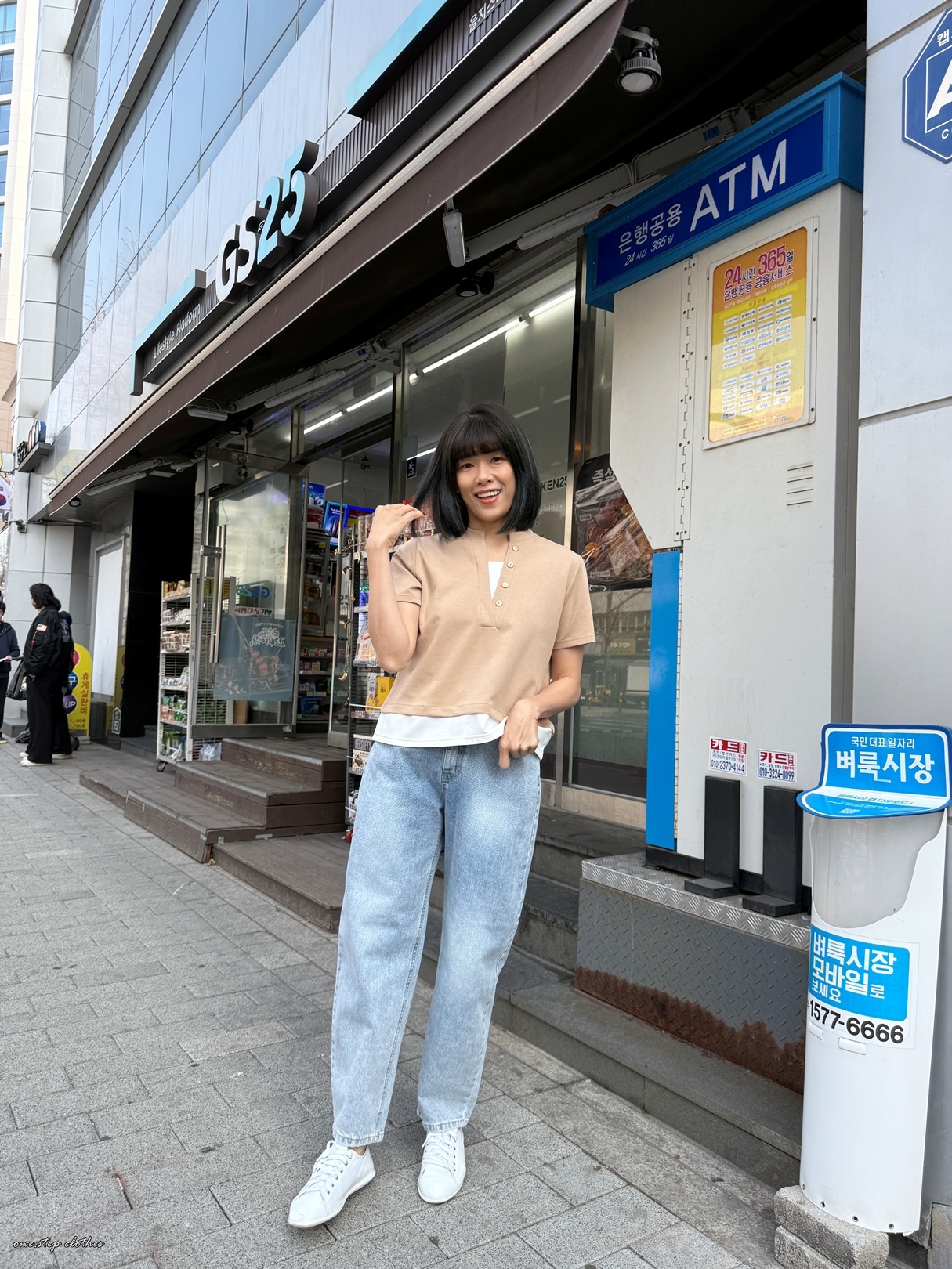 這款穿M,穿起來腰圍剛好,臀圍跟大腿都還有空間,弧形順下來但不會太寬,褲頭約中腰蓋到肚臍,褲長約9-9.5分