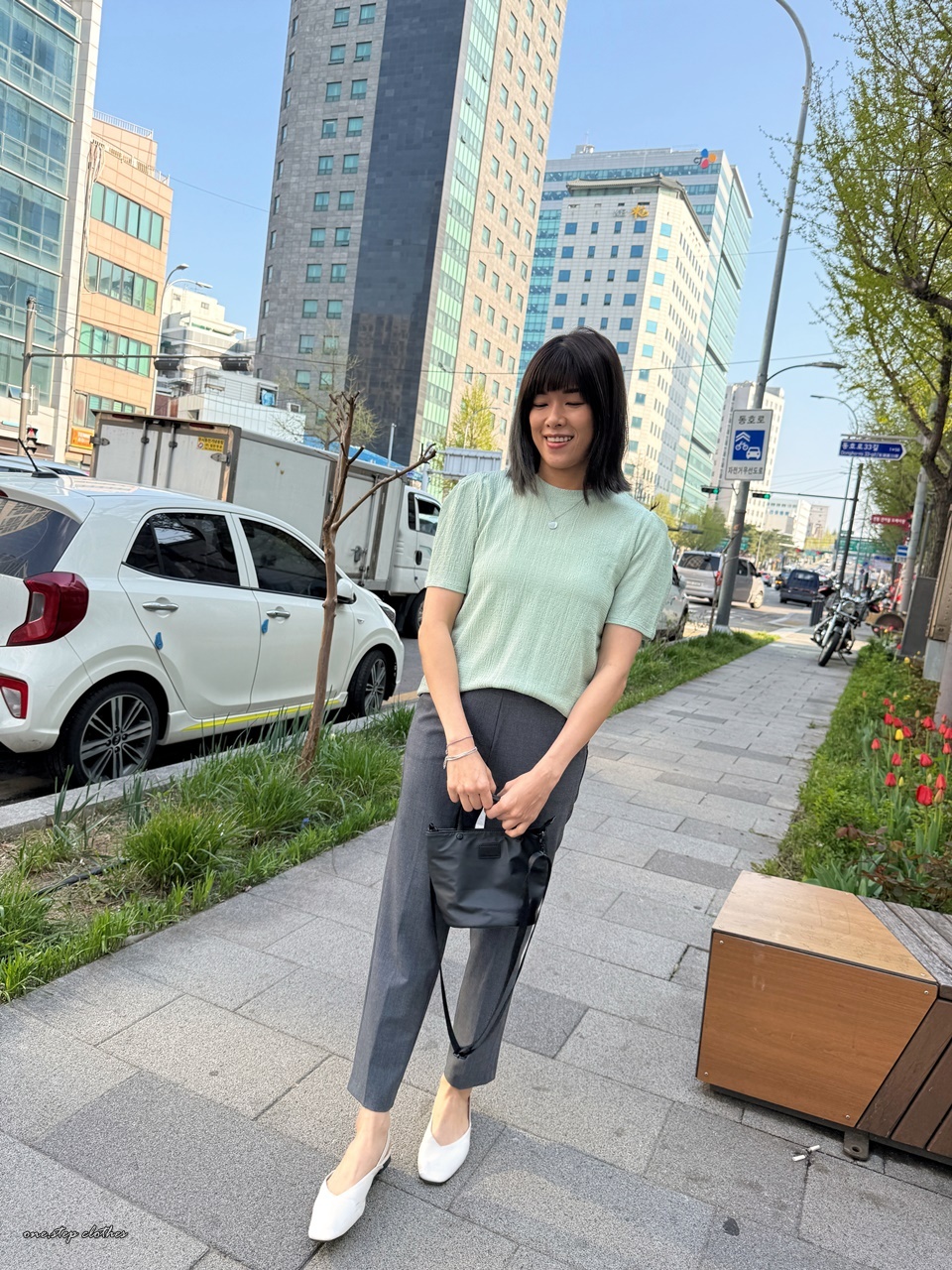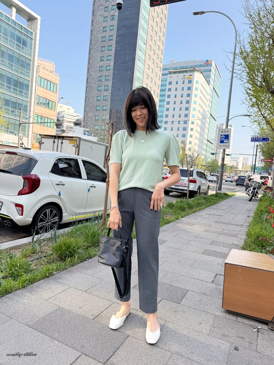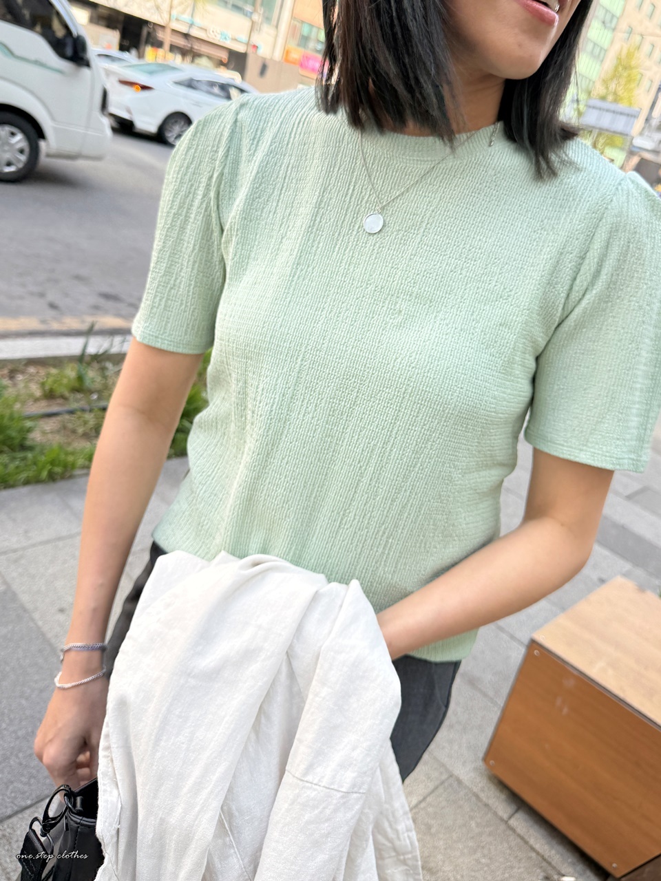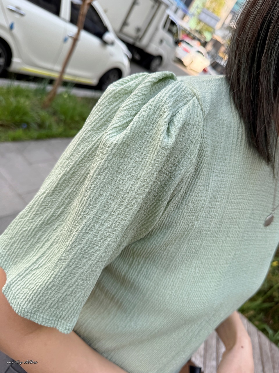 正韓氣質湖水綠系壓紋上衣