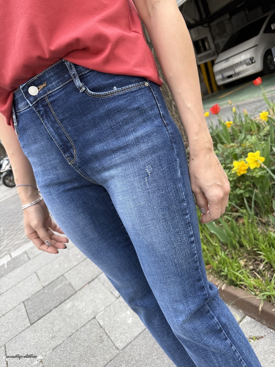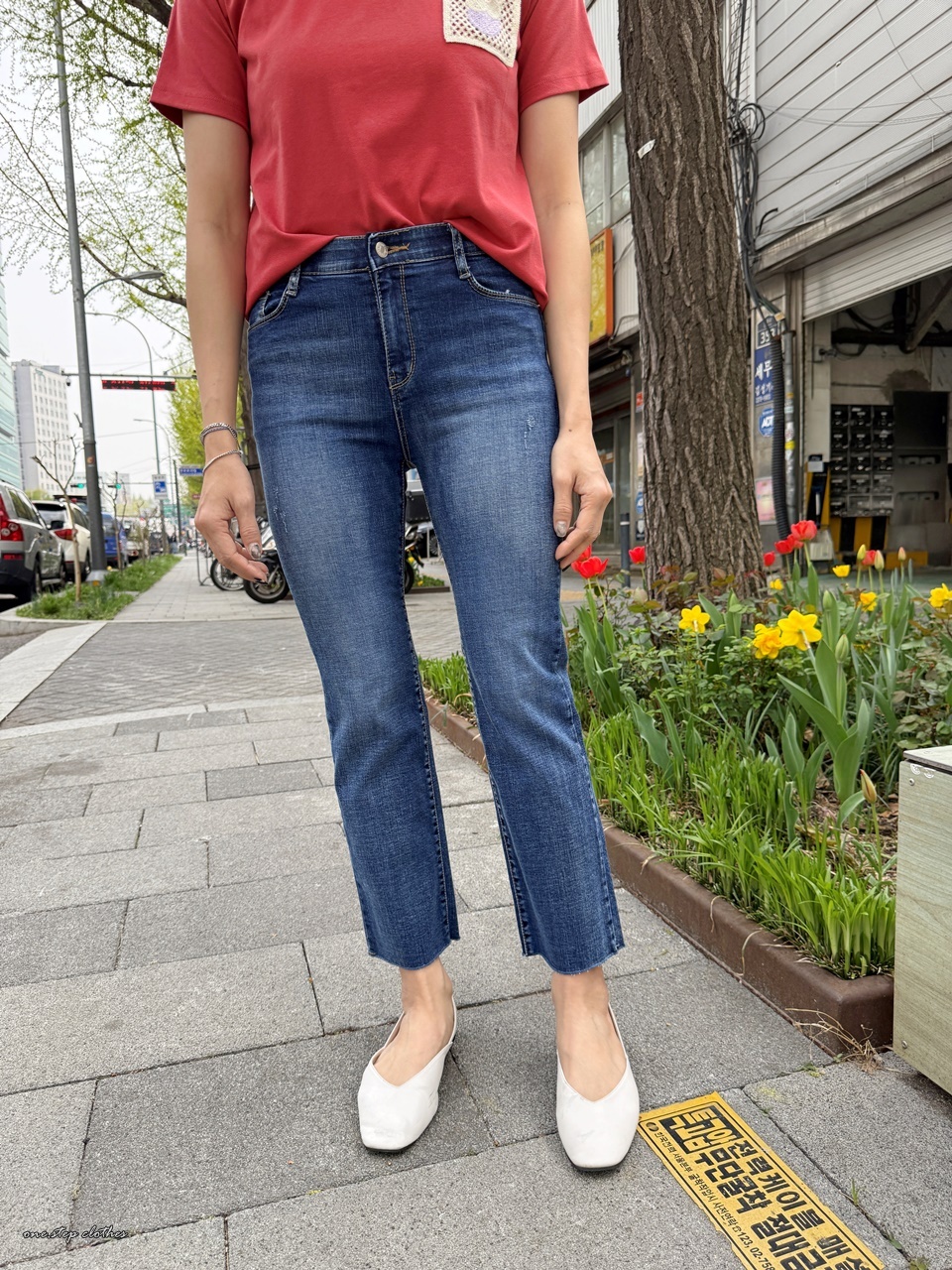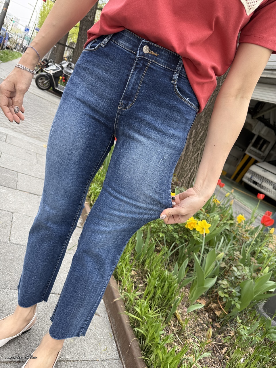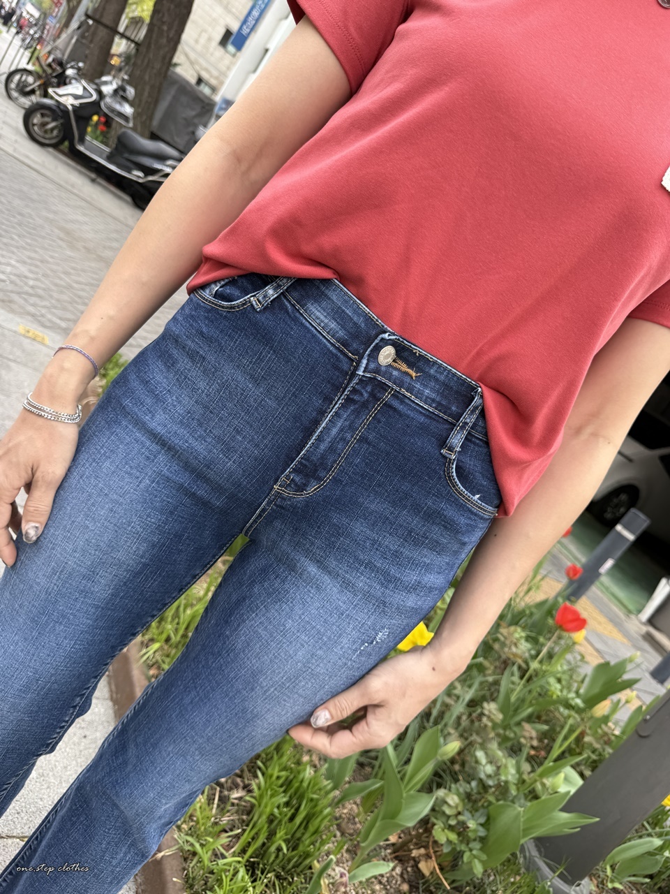 正韓氣質深藍刷破鬆緊合身小直筒