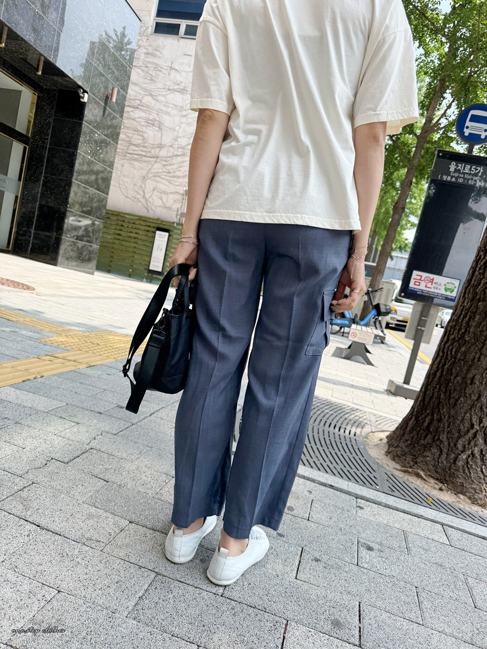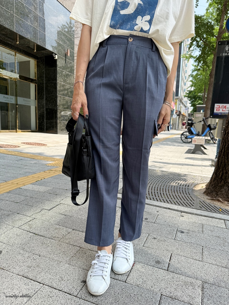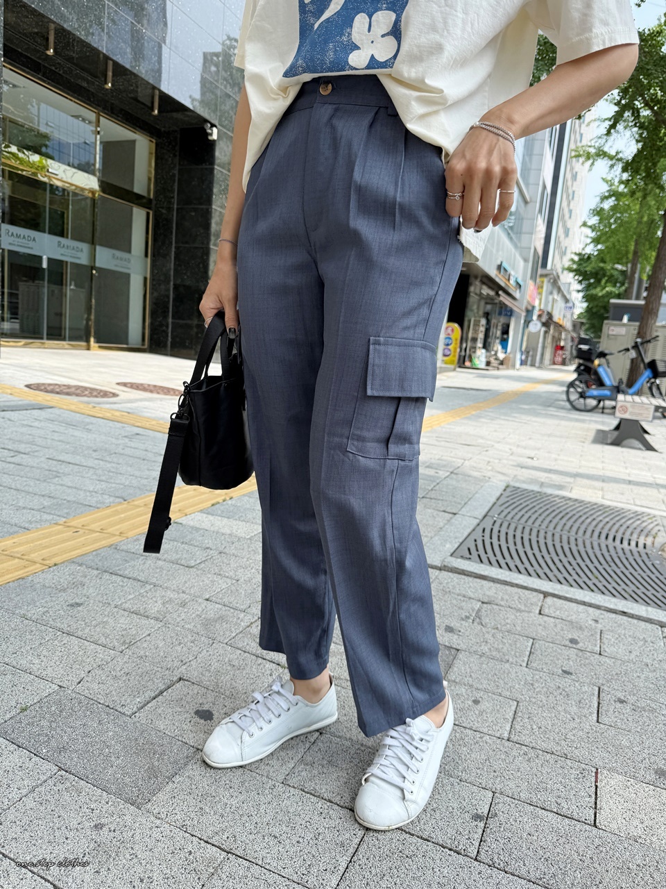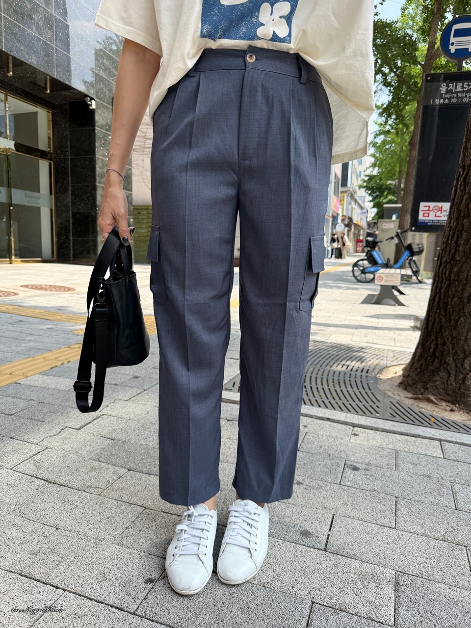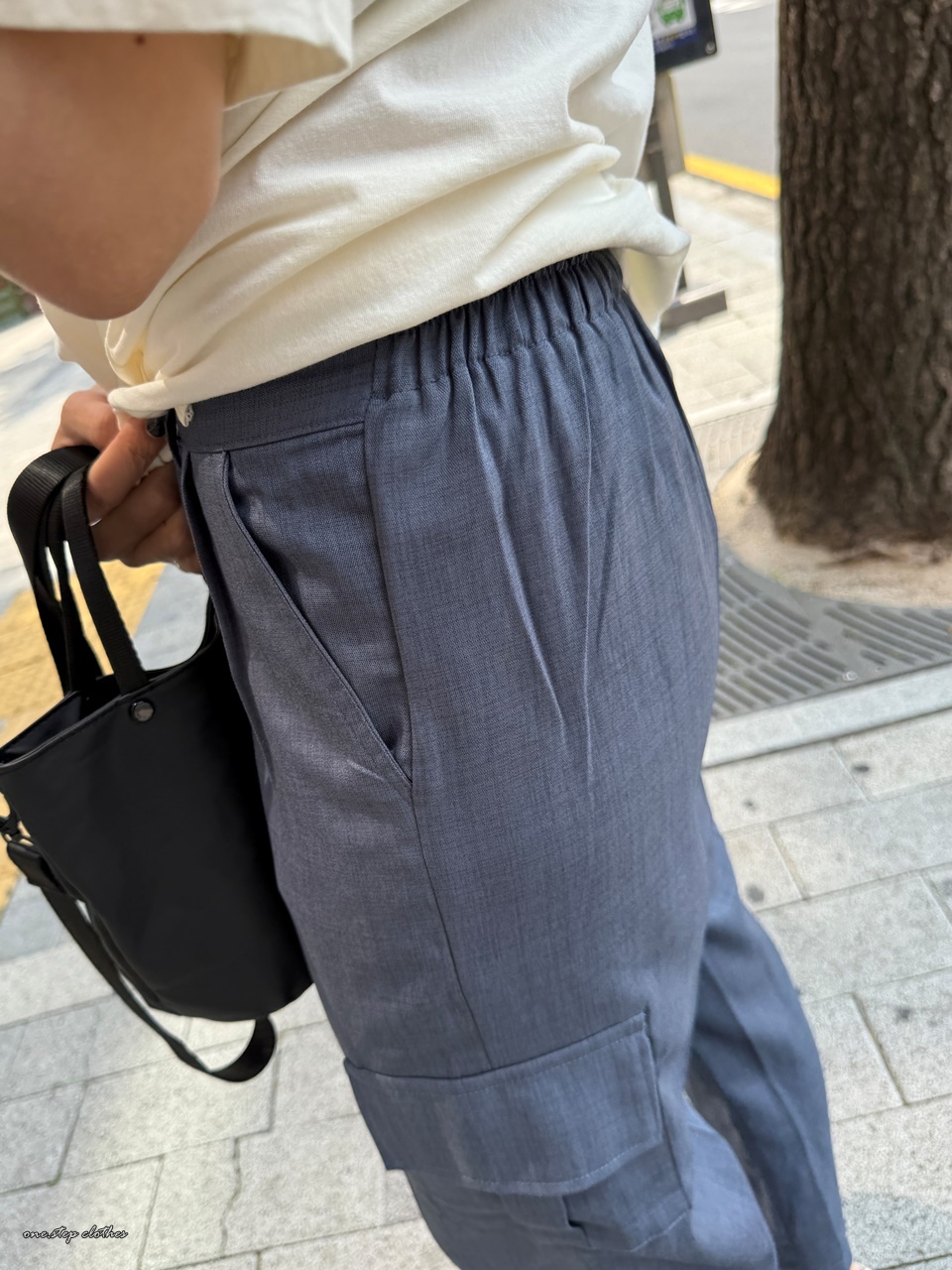 正韓紗質後鬆緊側口袋休閒褲 (藍灰)