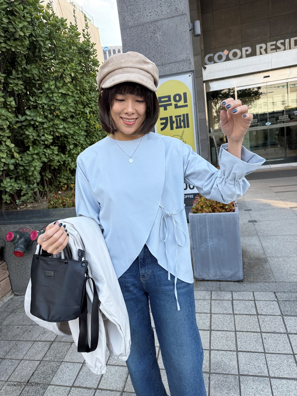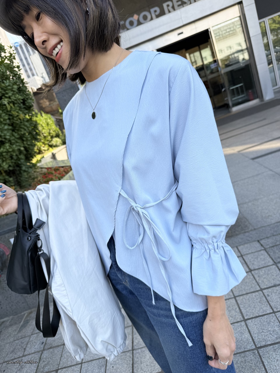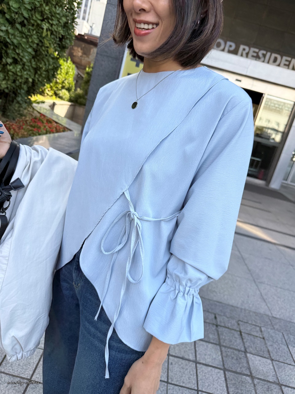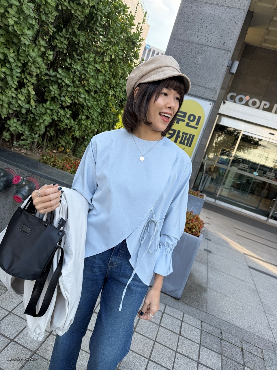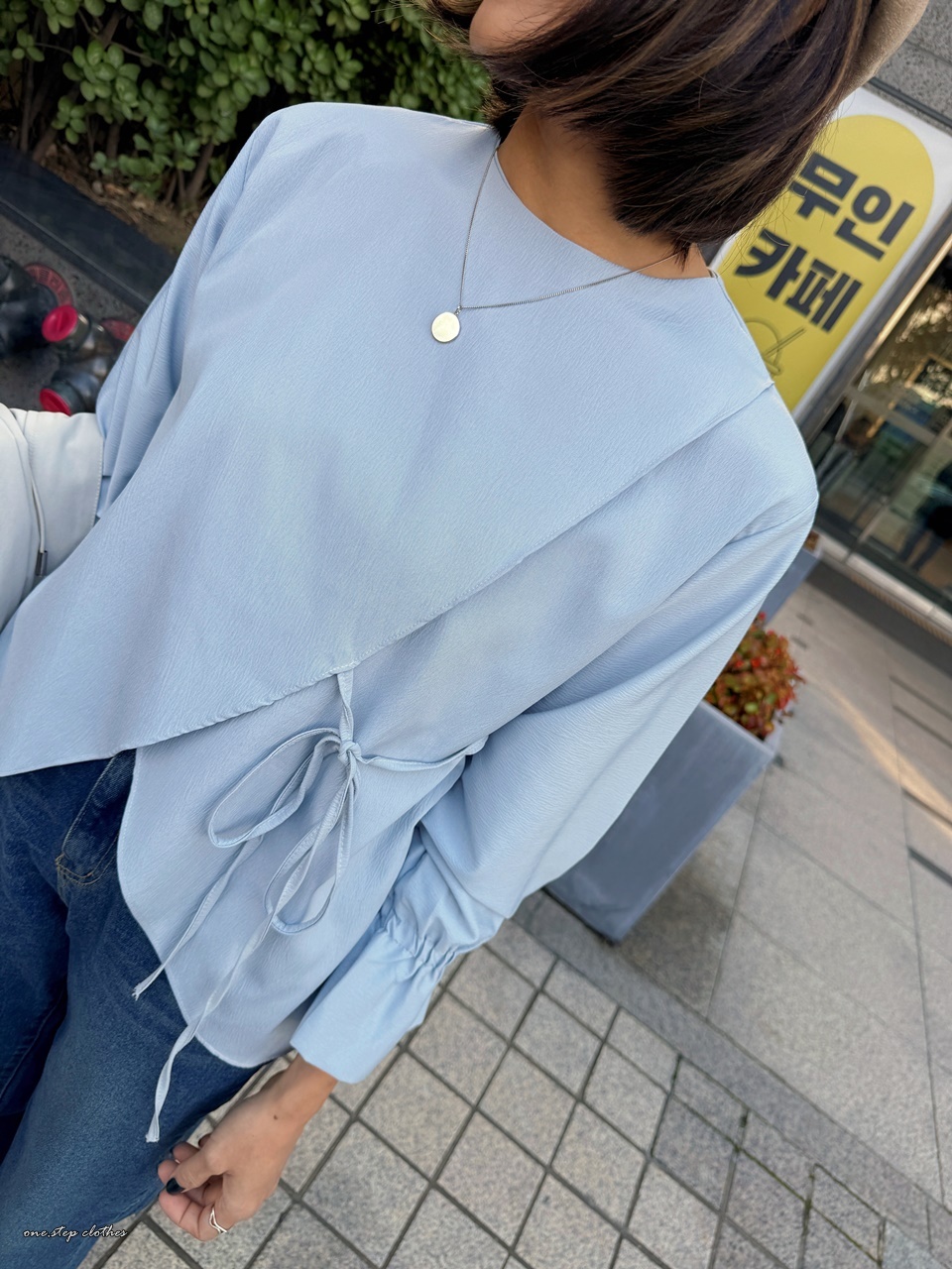 正韓溫柔斜邊綁帶雪紡衫 (水藍)