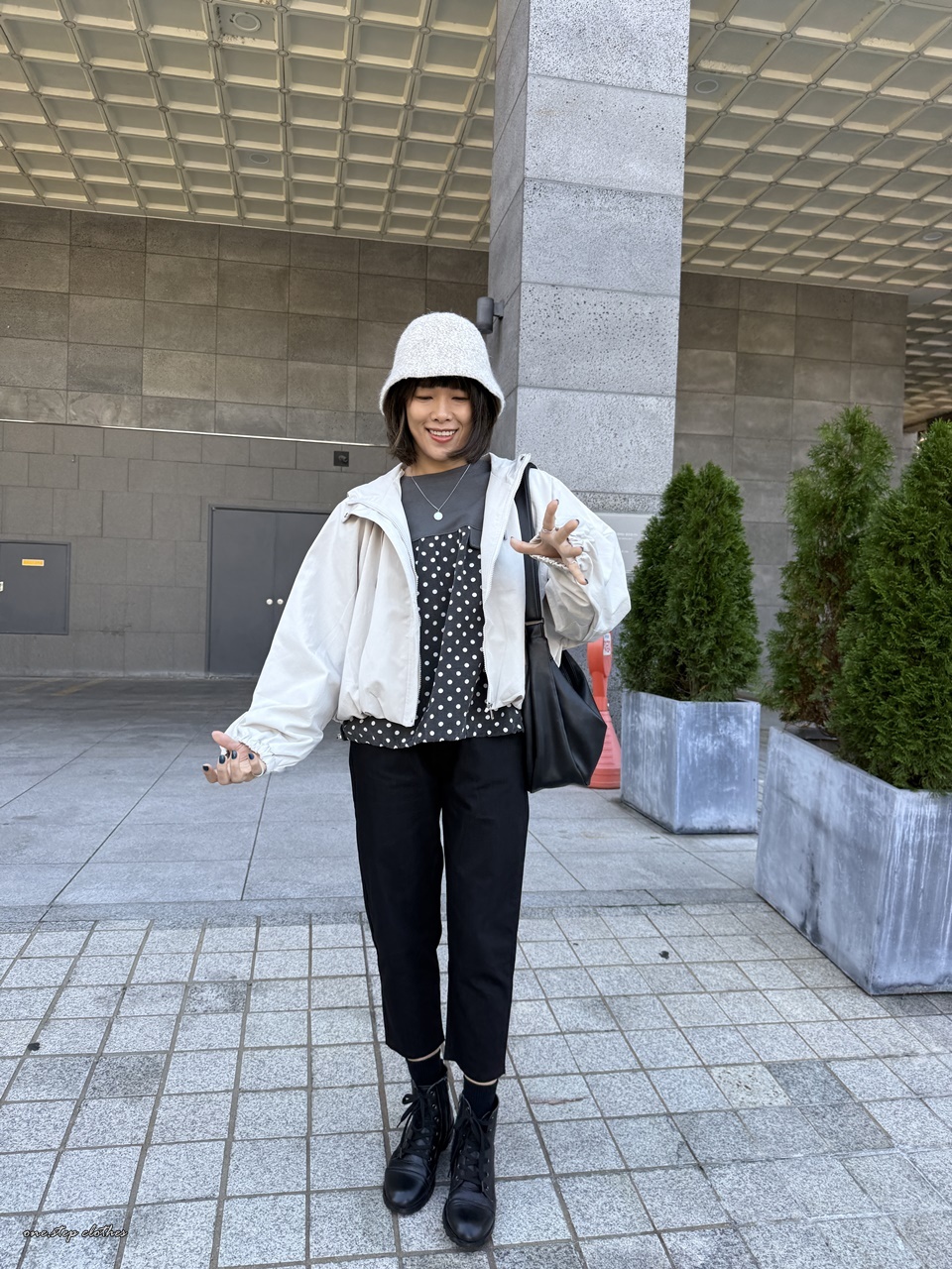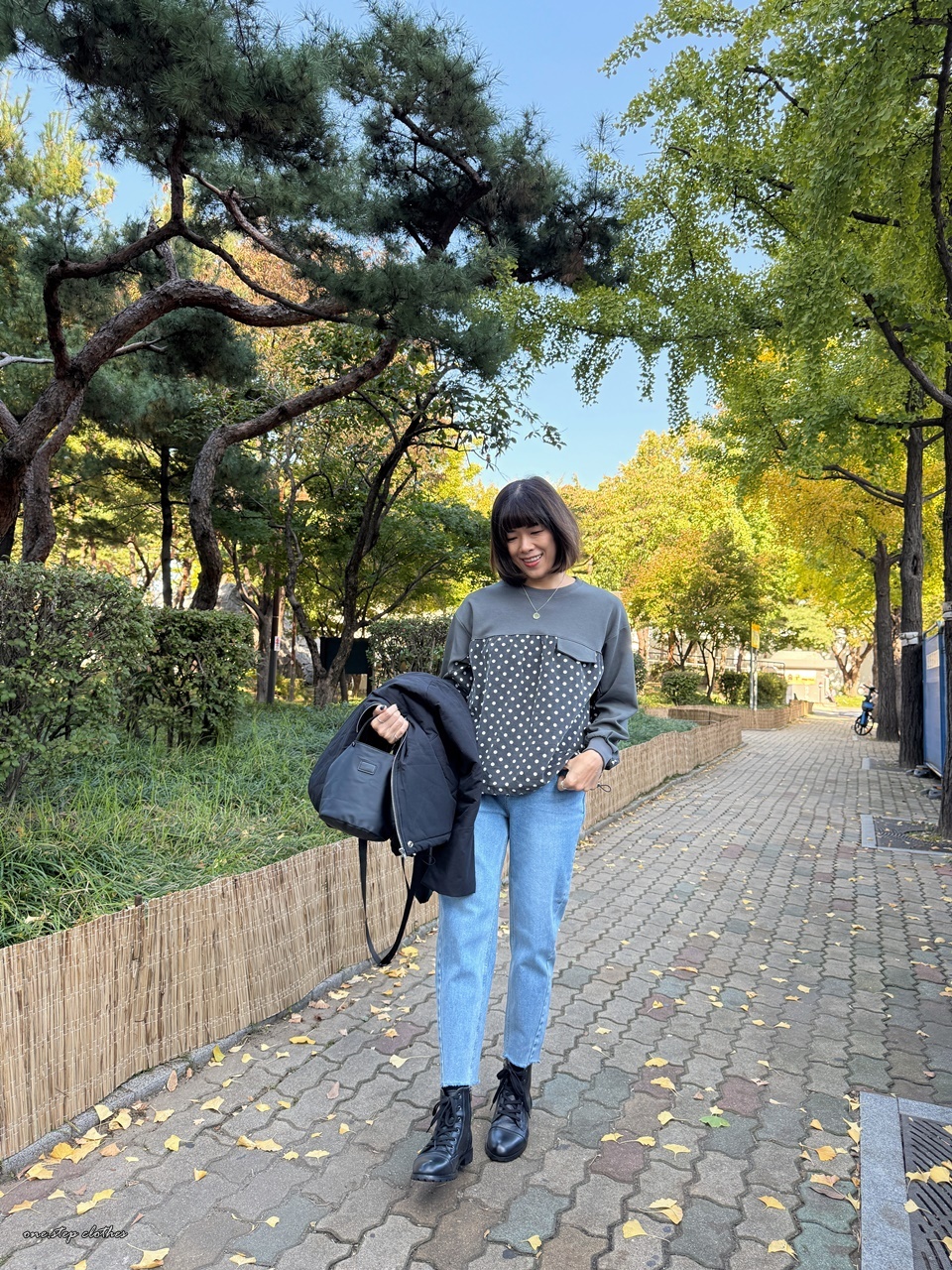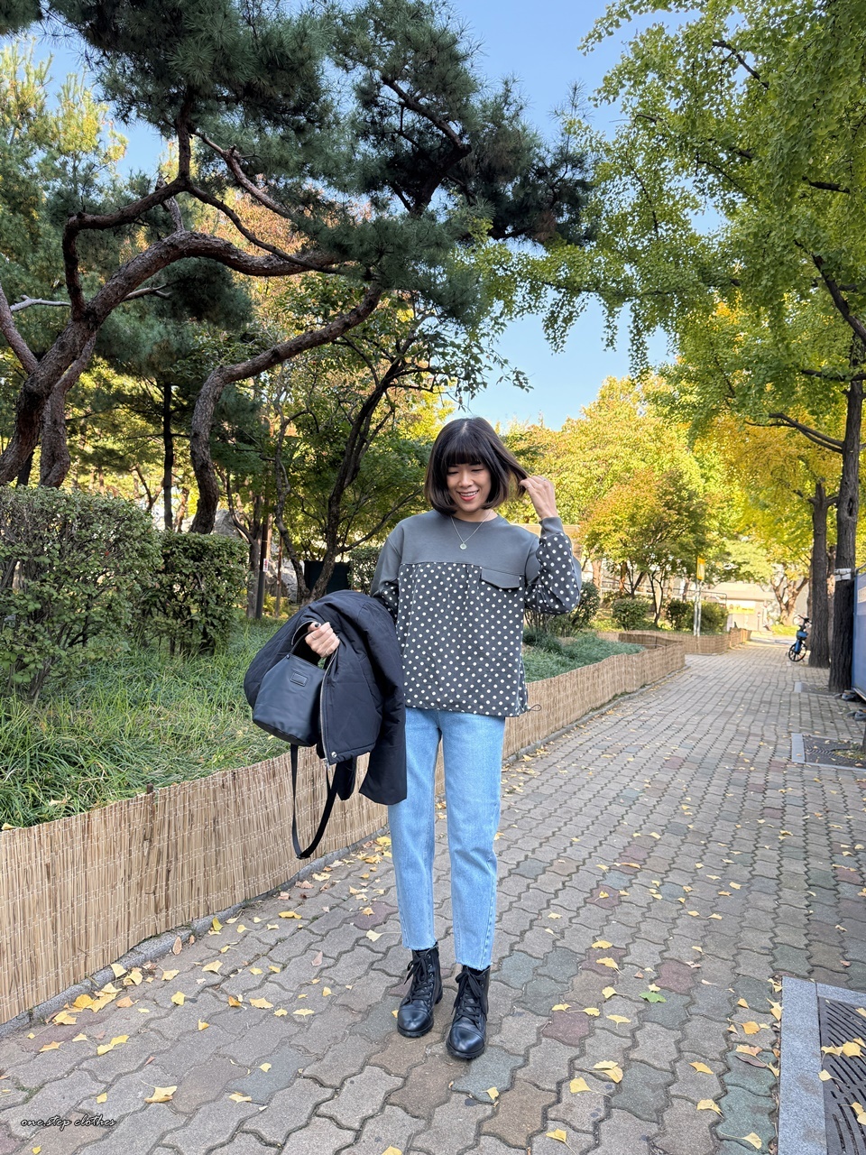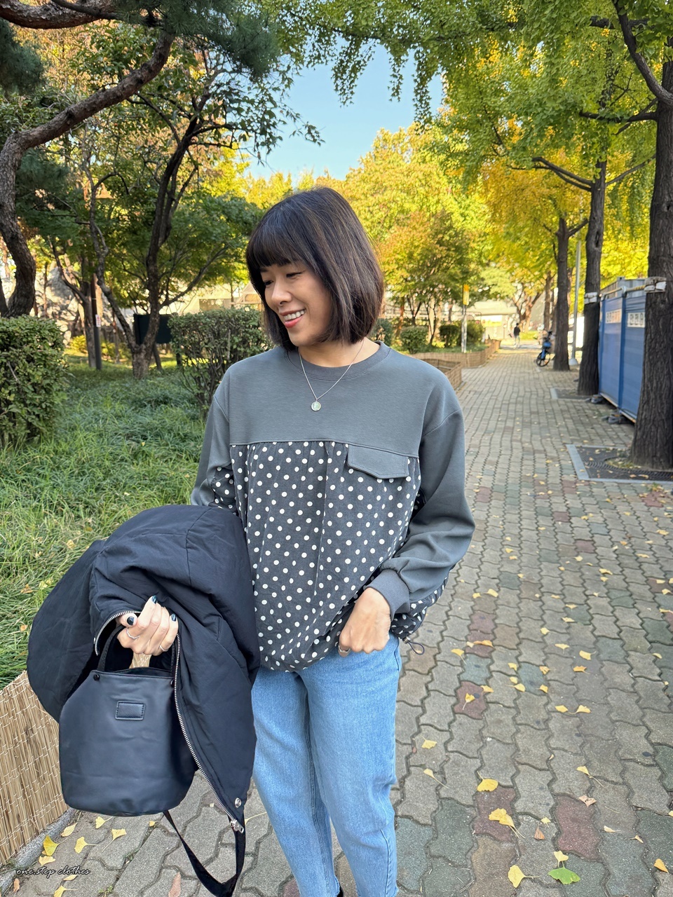 正韓俏皮燈心絨點點拼接上衣 (灰)