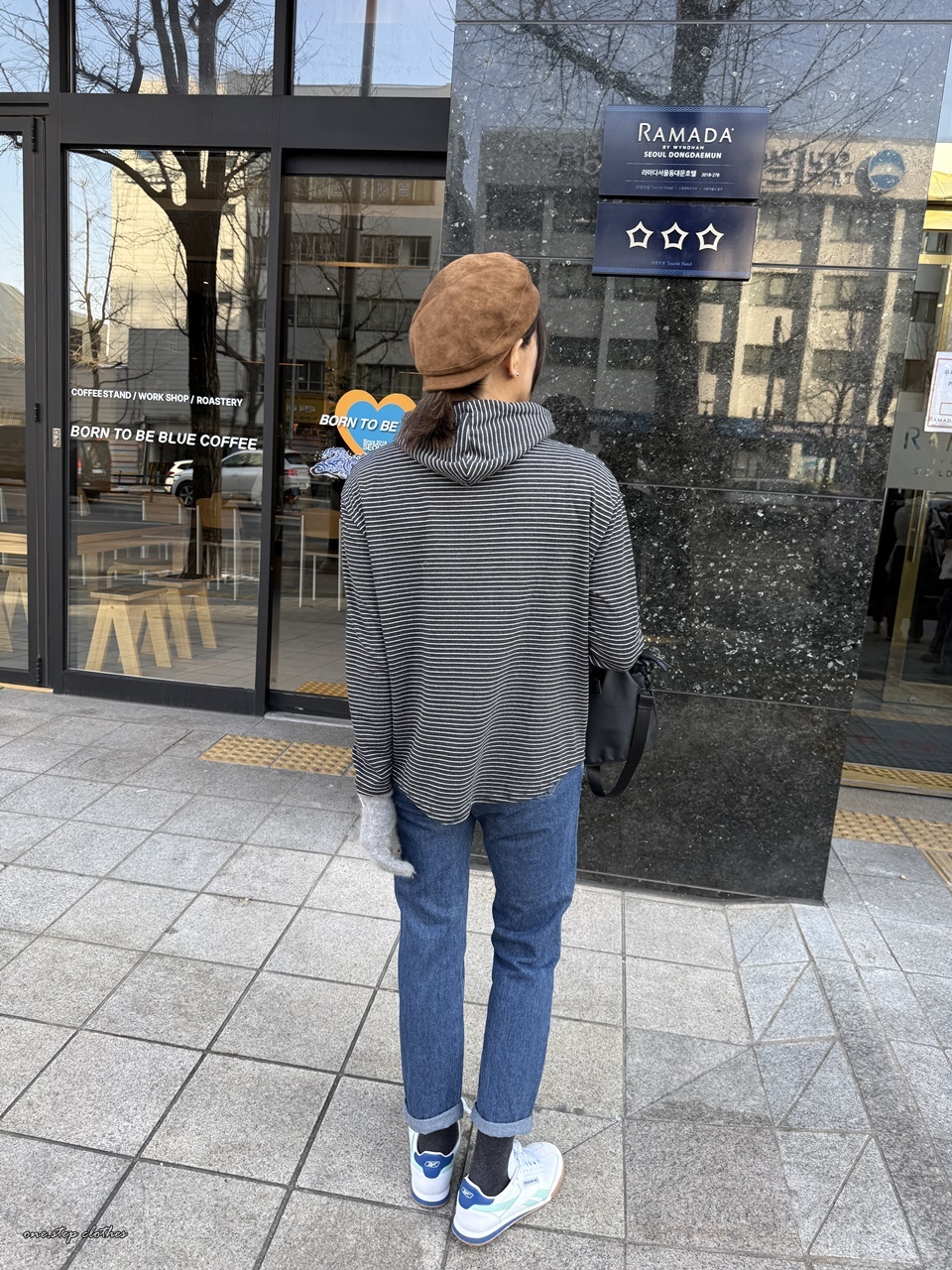 正韓立領細橫條帽T (深灰)