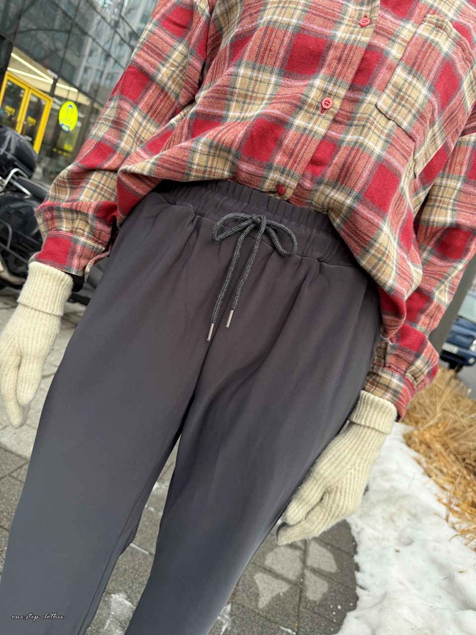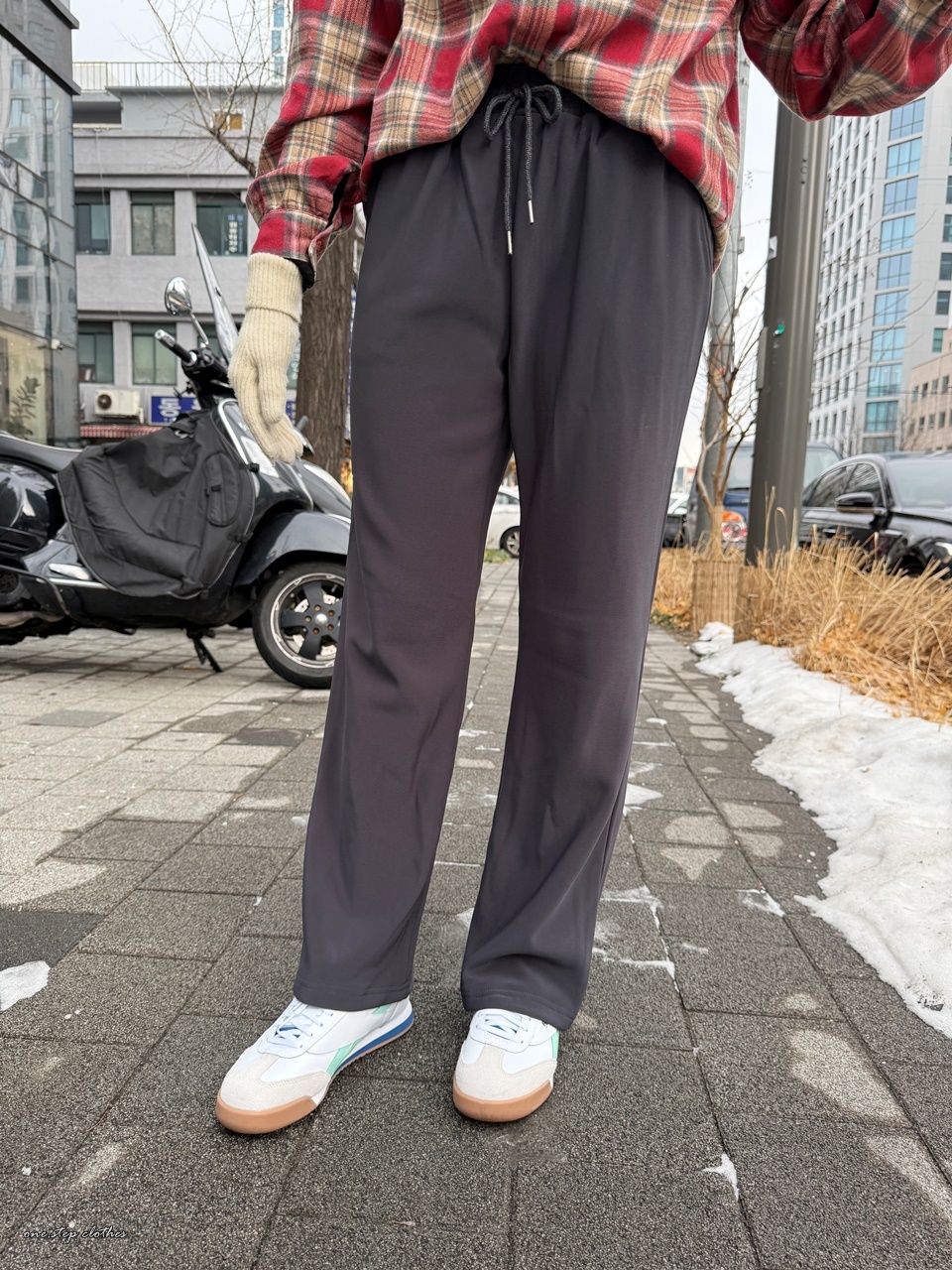 正韓簡約散步刷毛綁帶長褲 (灰)
