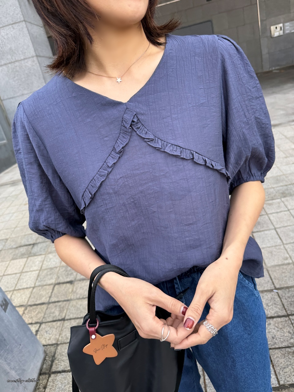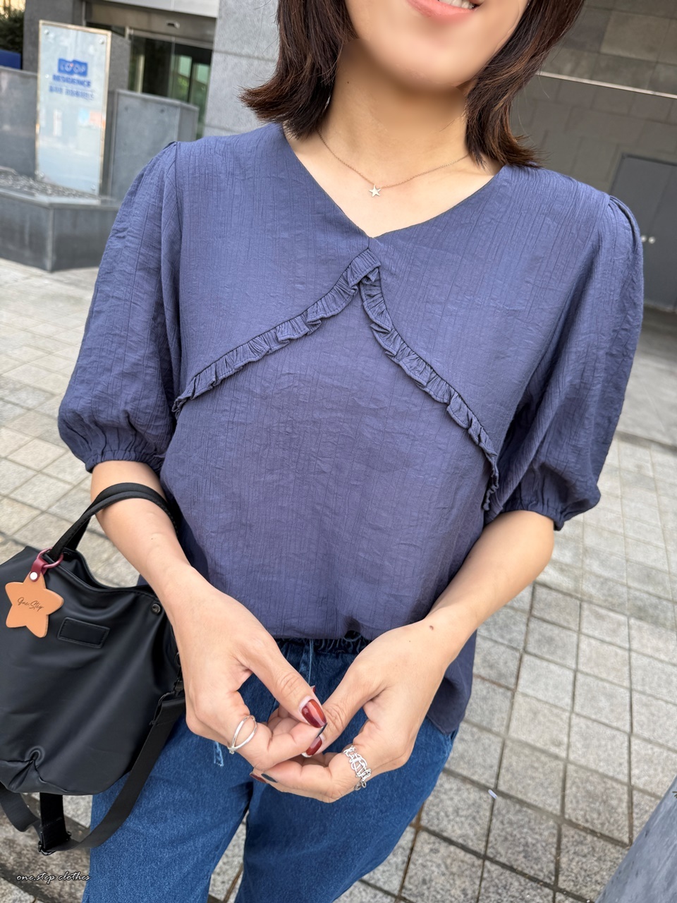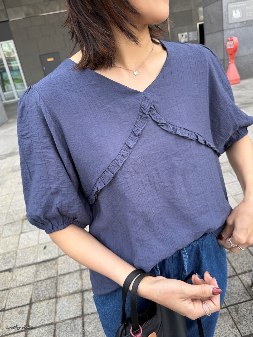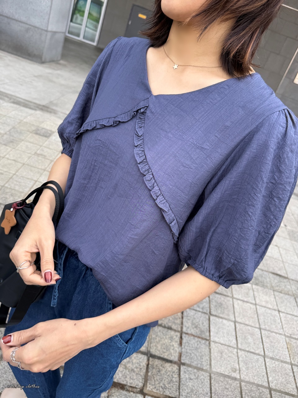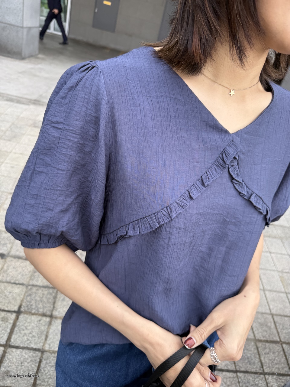正韓圓弧花邊雪紡上衣 (藍)