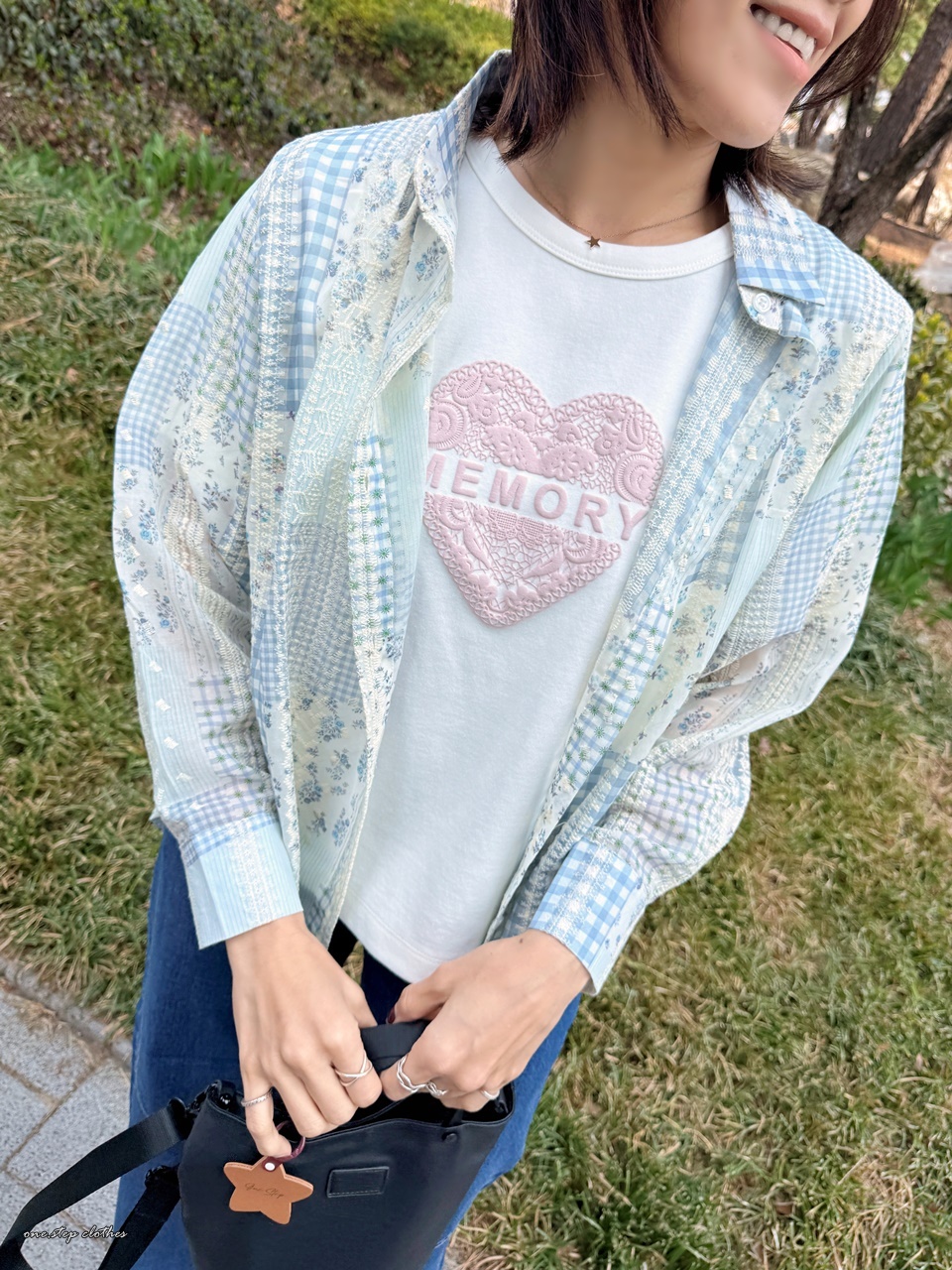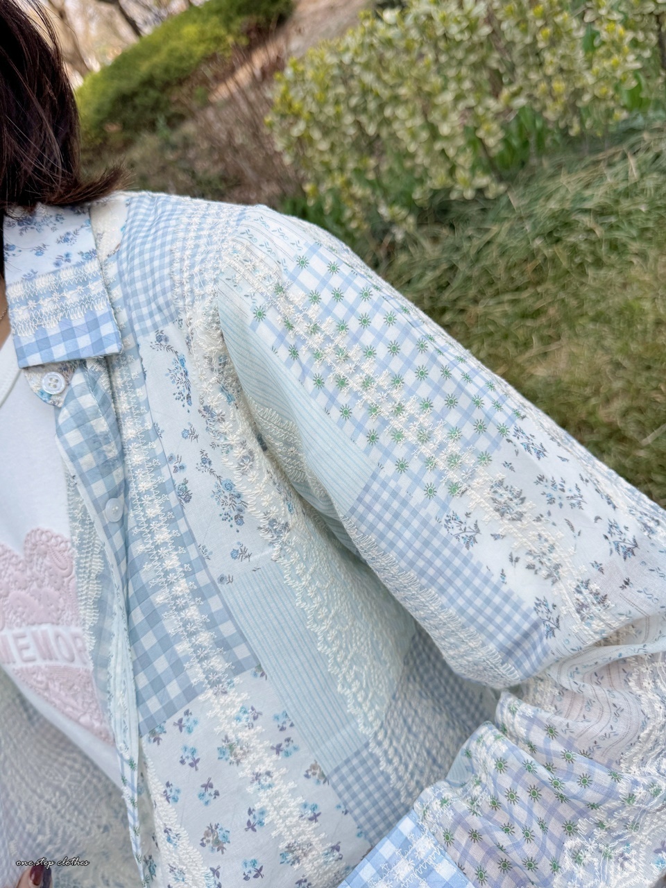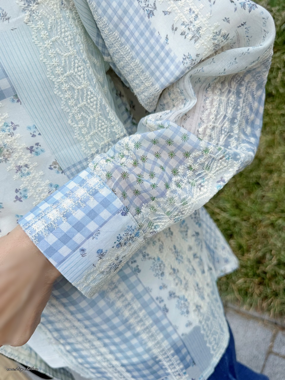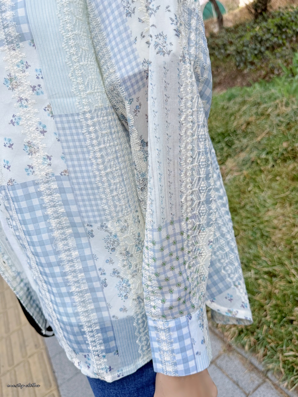 正韓浮雕蕾絲小花田園襯衫 (藍)