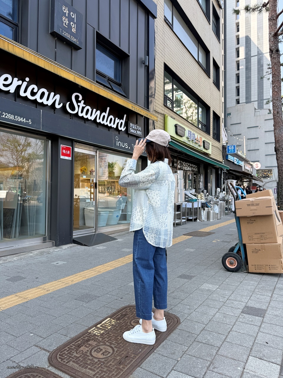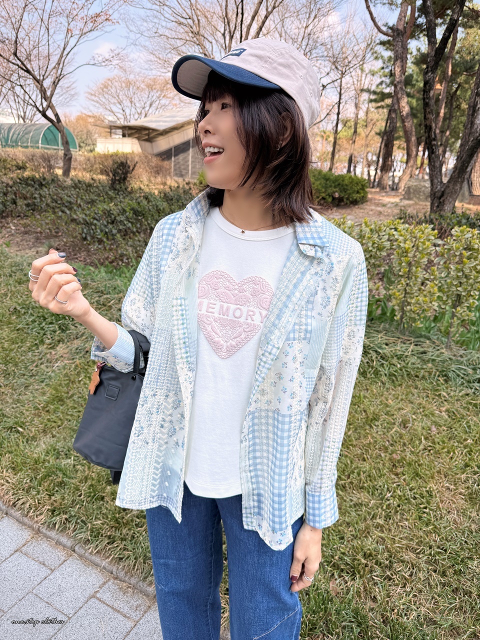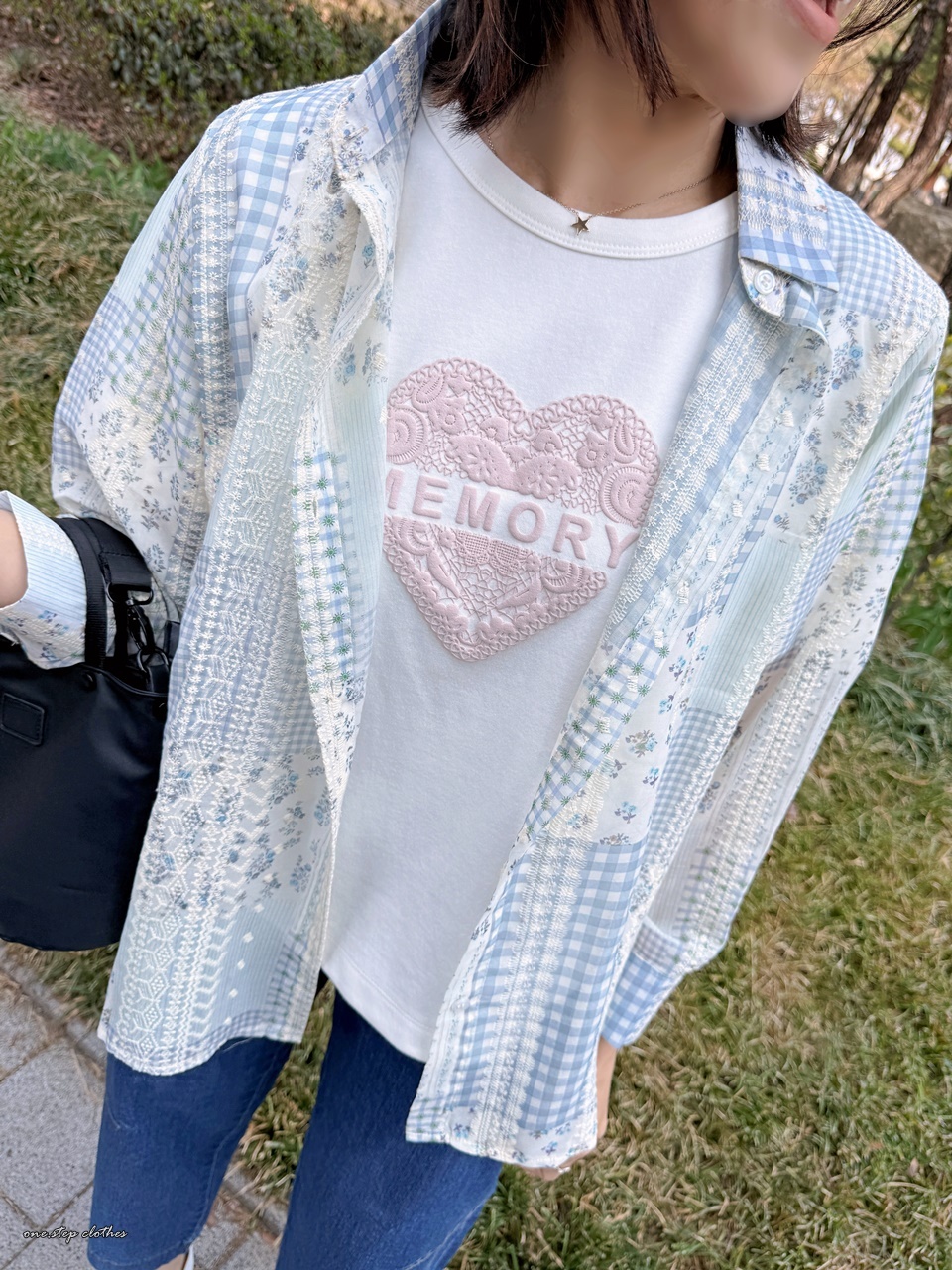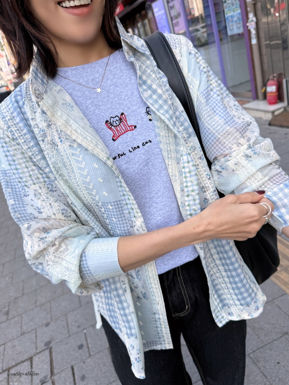 正韓浮雕蕾絲小花田園襯衫 (藍)