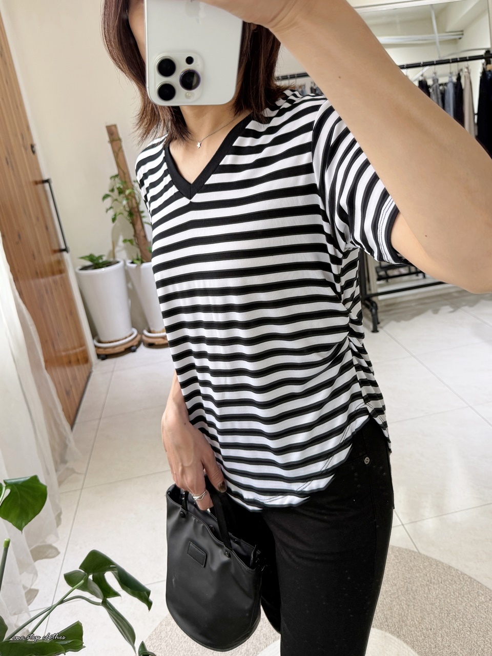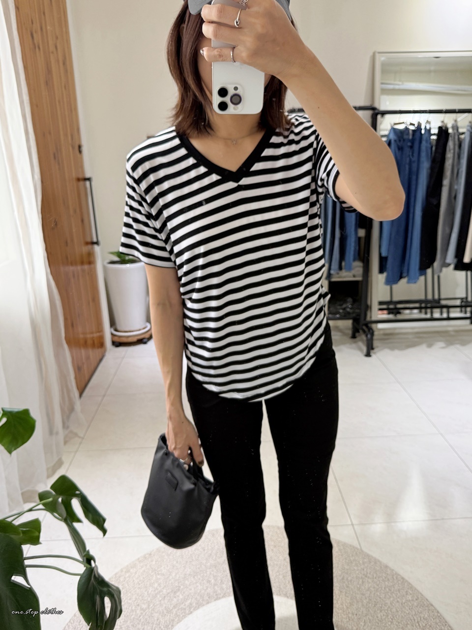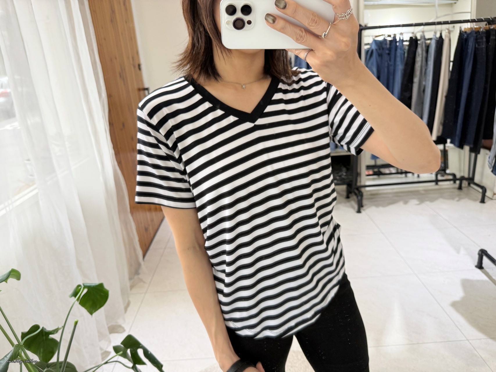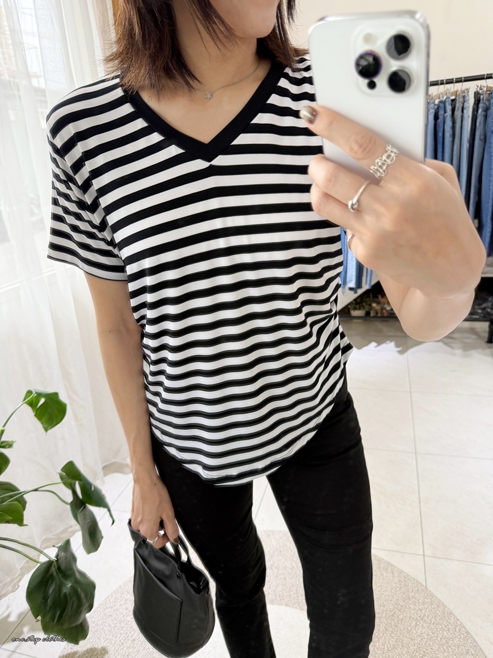 正韓V領彈性萊卡橫條上衣