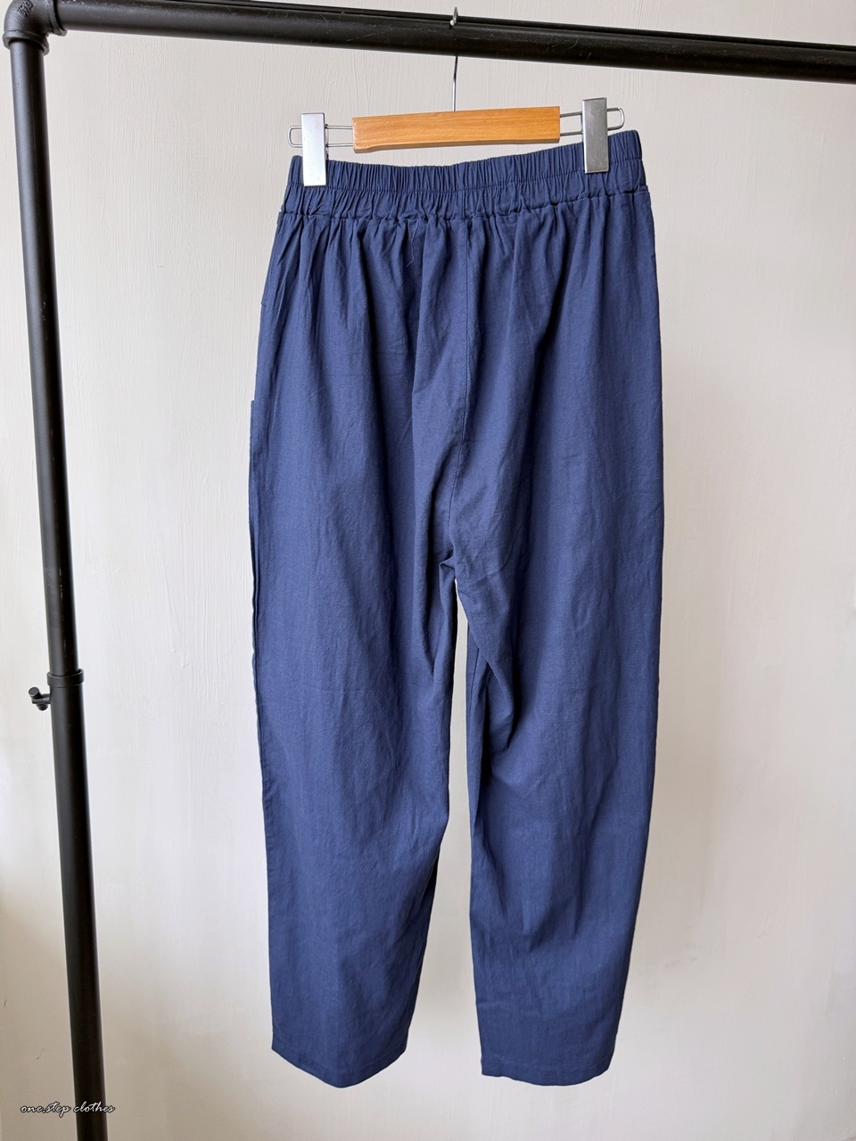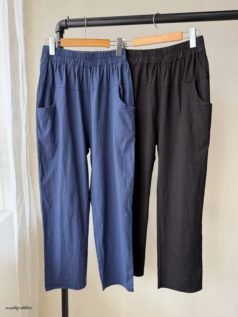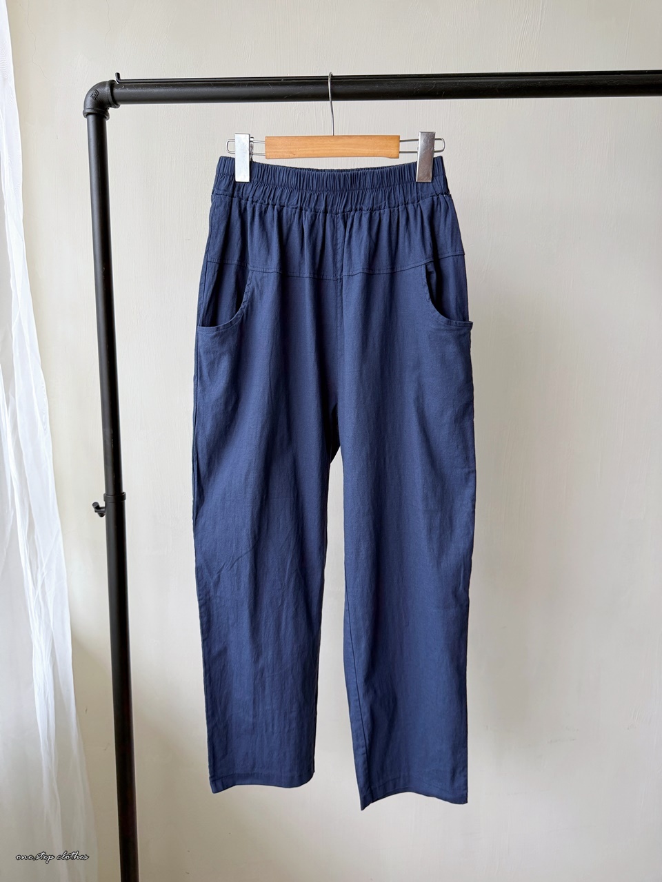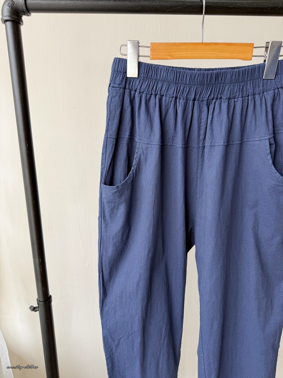 正韓自在感口袋鬆緊棉麻褲 (藍)